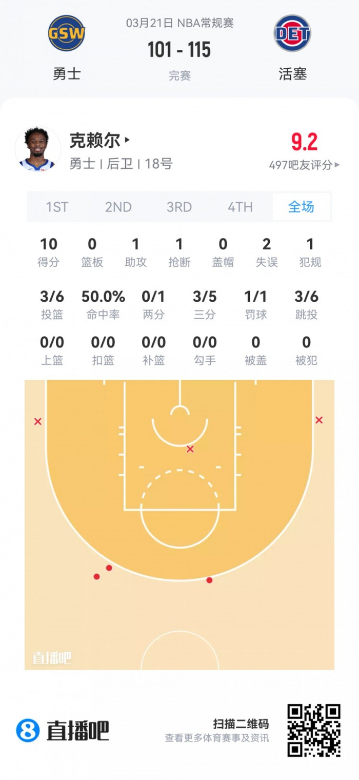 勇士落选秀克赖尔 登场16分钟