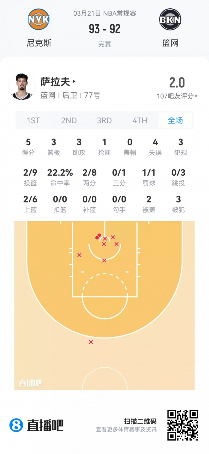 篮网首轮26号秀萨拉夫 登场27.4分钟