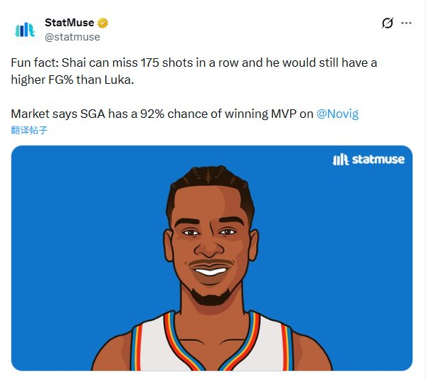 体育预测市场平台@Novig表示SGA(亚历山大)有92%的机会赢得(常规赛)MVP。