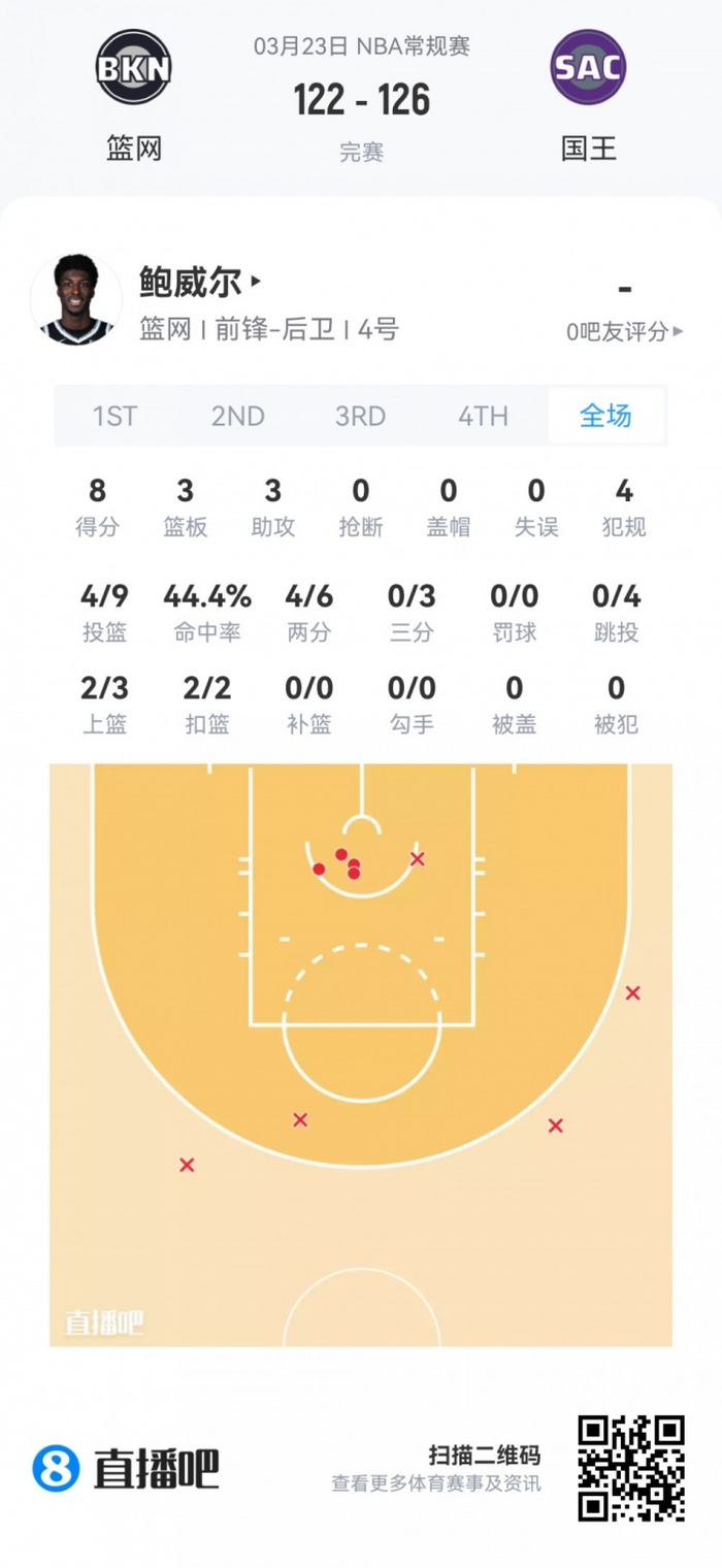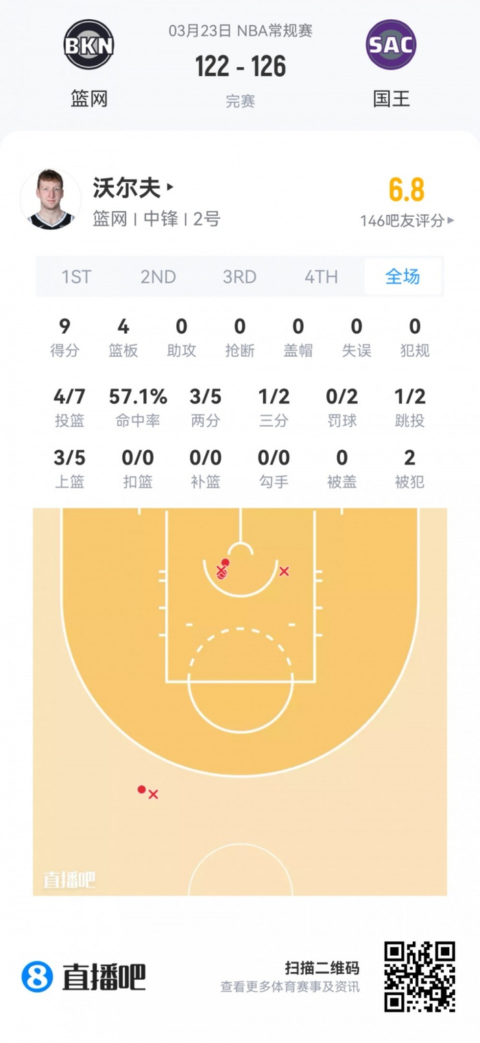 篮网首轮27号秀沃尔夫 登场12.4分钟