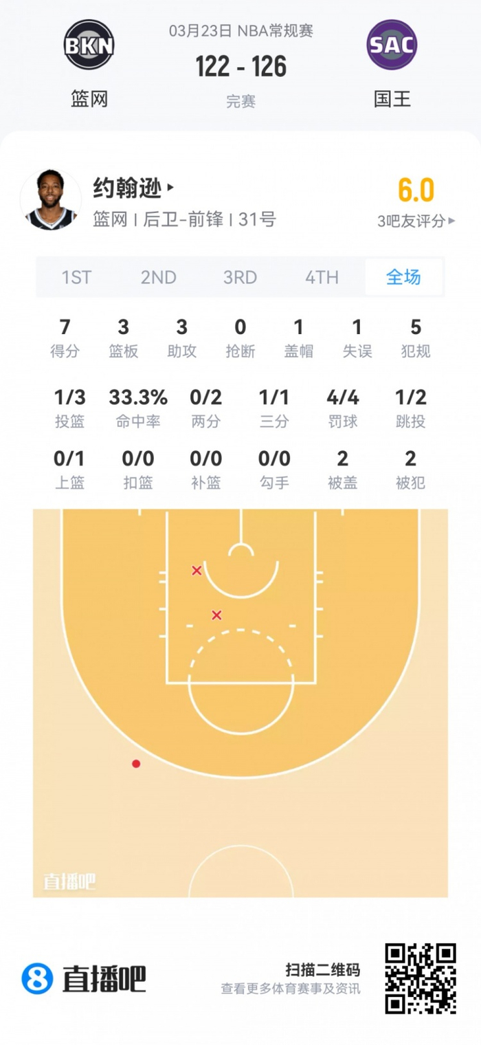 篮网落选秀钱尼·约翰逊 登场16.5分钟