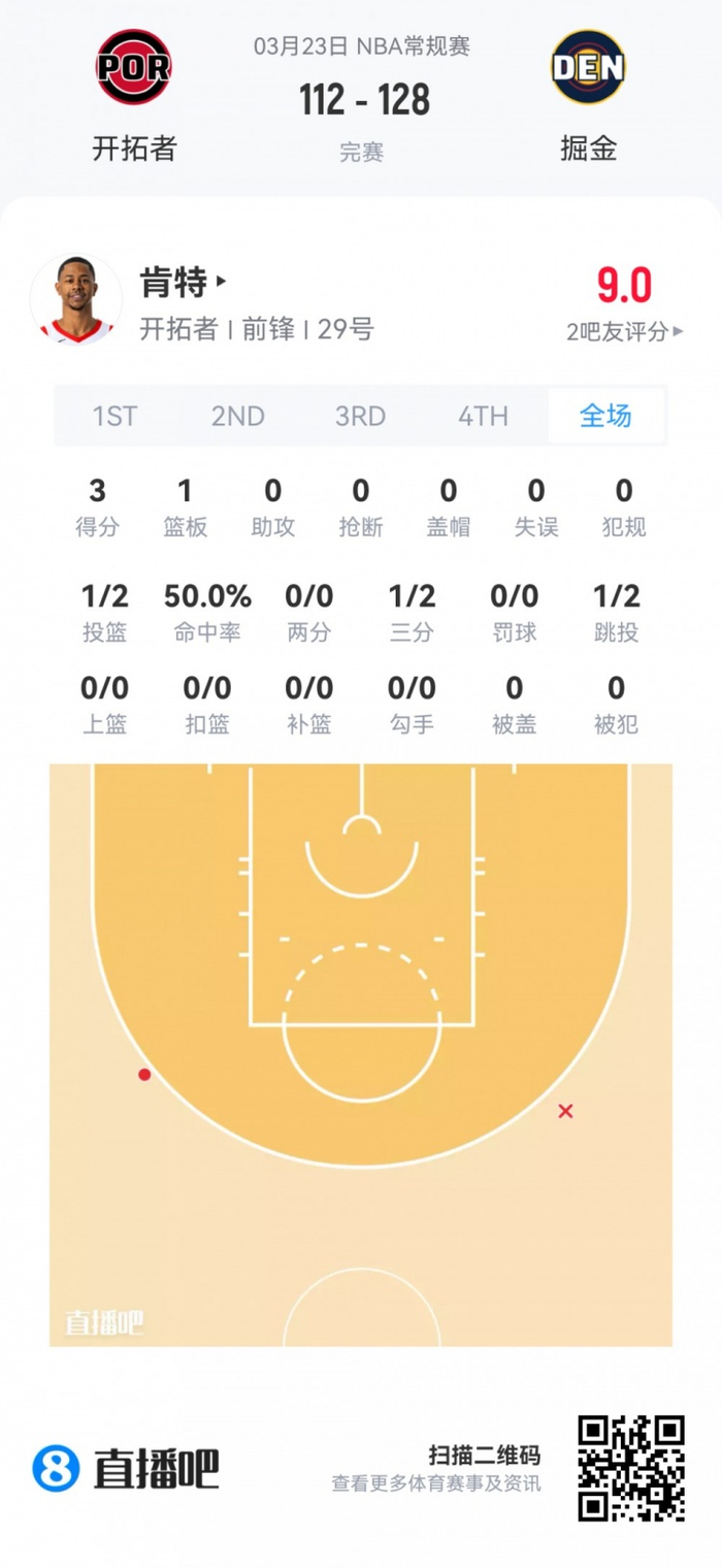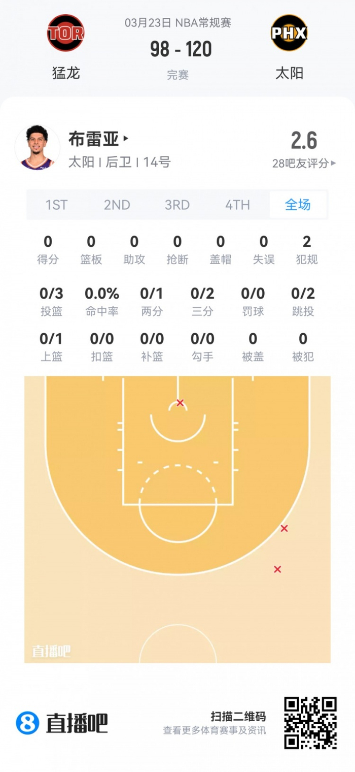 太阳次轮41号秀科比·布雷亚 登场4.7分钟