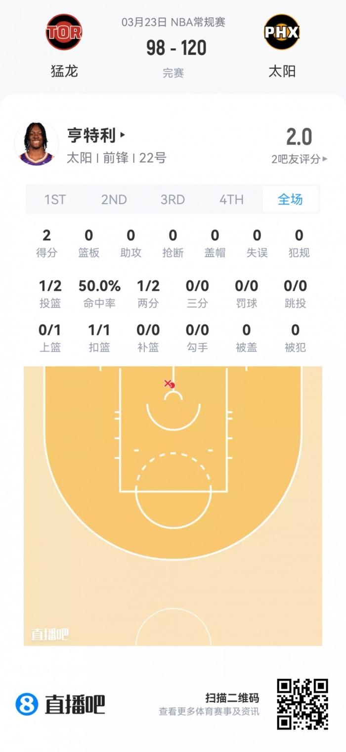 太阳落选秀CJ·亨特利 登场4.7分钟