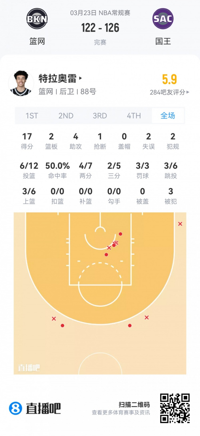 篮网首轮19号秀特拉奥雷 登场26.1分钟
