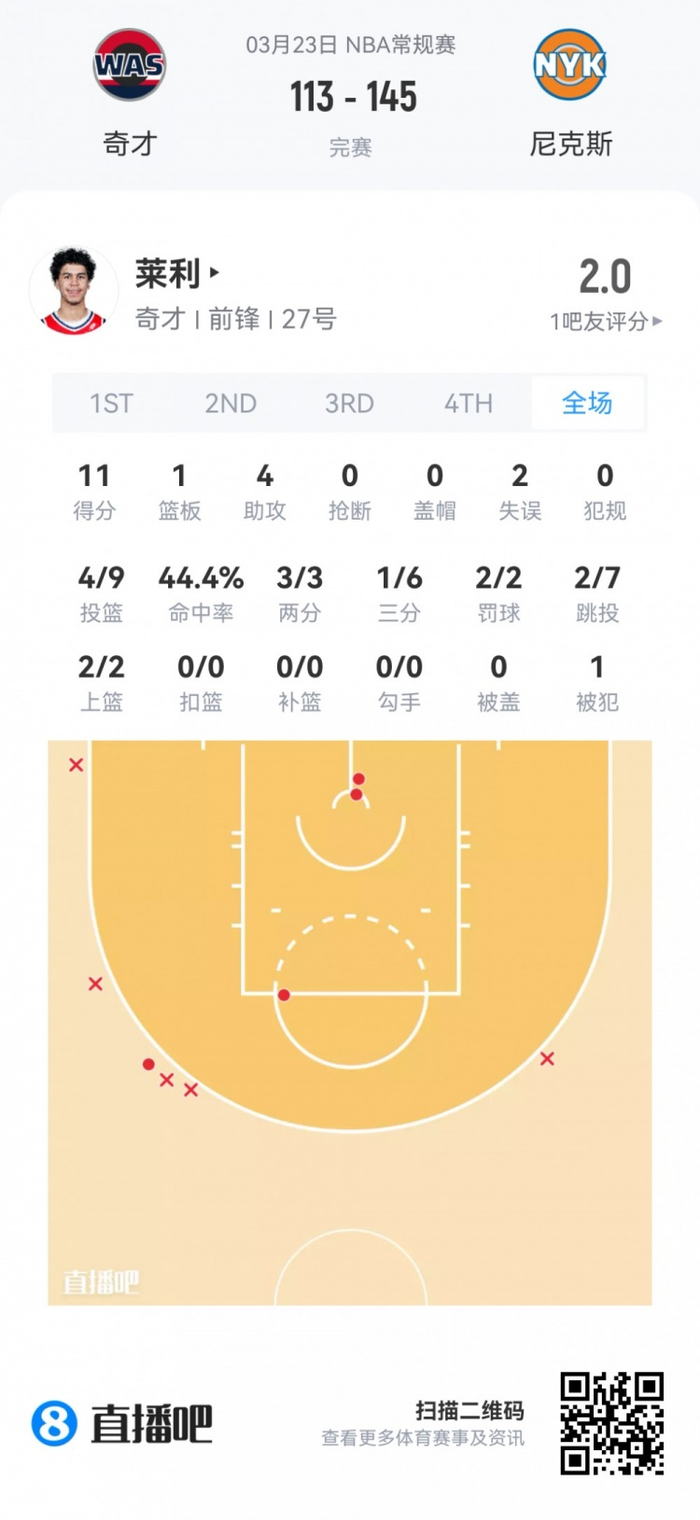 奇才首轮21号秀威尔·莱利 登场29.5分钟