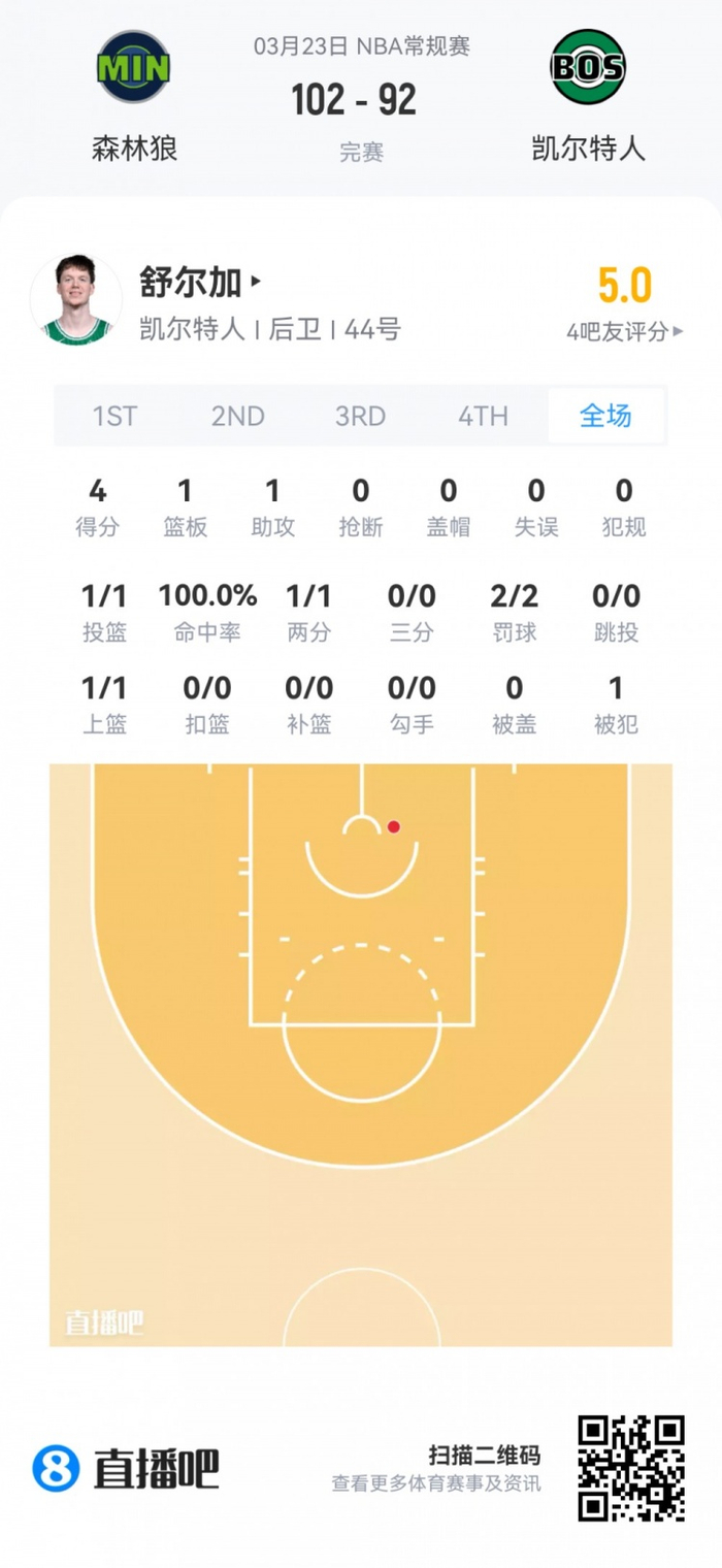 凯尔特人次轮57号秀舒尔加 登场1.8分钟