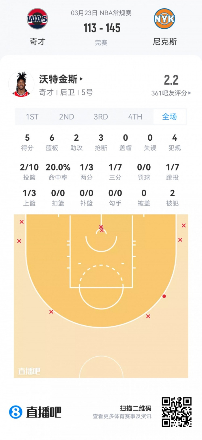 奇才次轮43号秀沃特金斯 登场30.7分钟