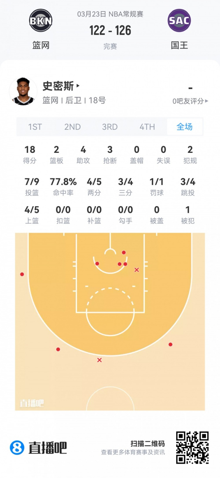 篮网落选秀马拉奇·史密斯 登场29.3分钟
