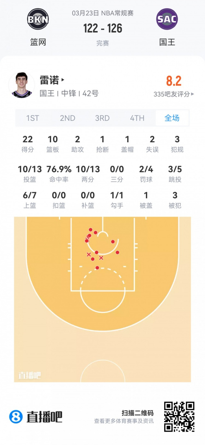 国王次轮42号秀马克西姆·雷诺 登场36.4分钟