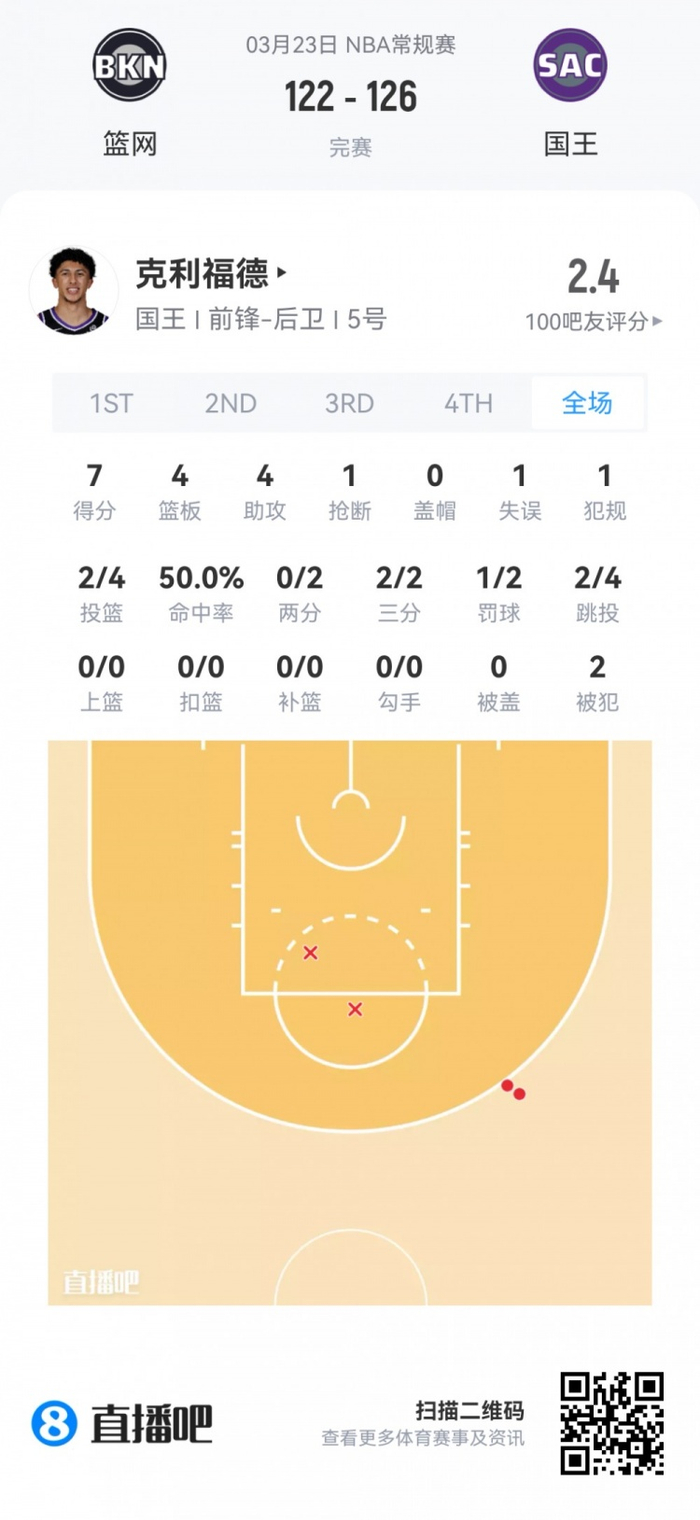 国王首轮24号秀尼克·克利福德 登场26.6分钟