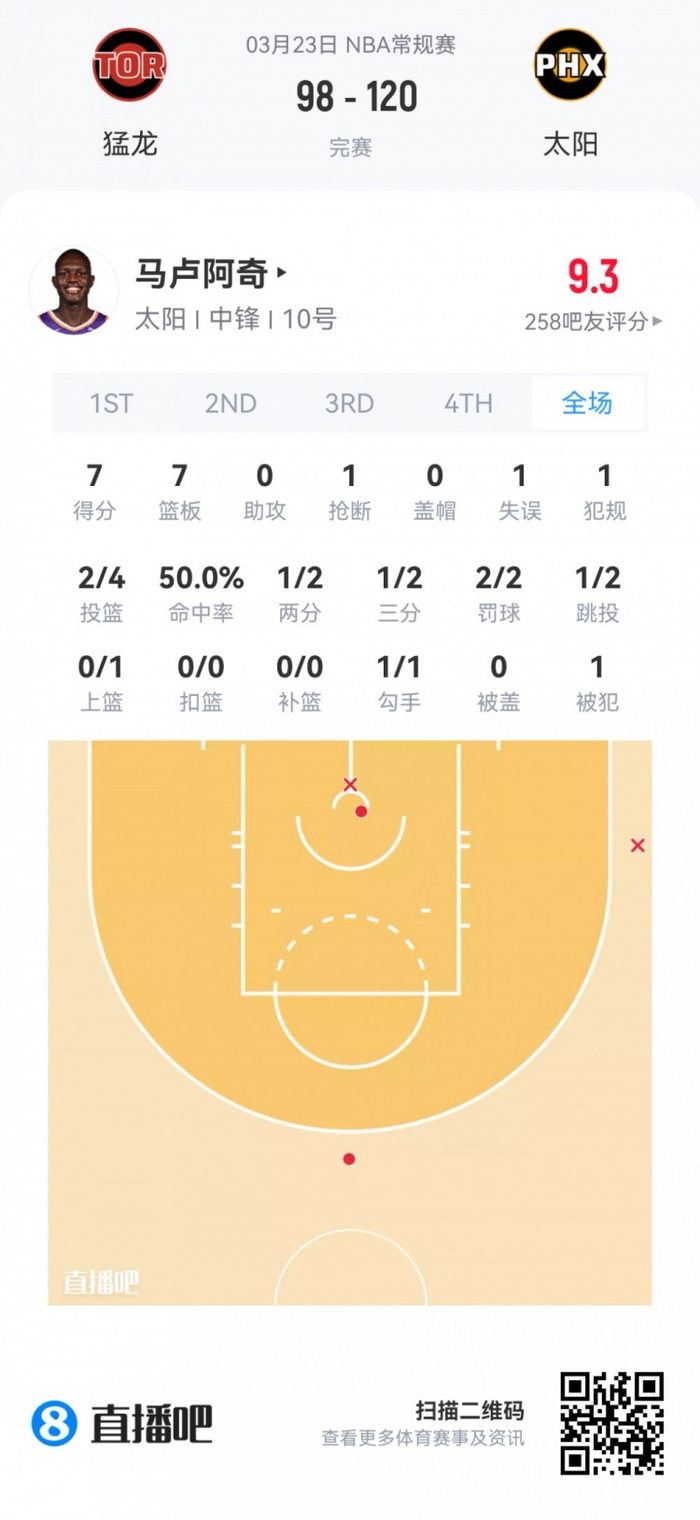 太阳首轮10号秀马卢阿奇 登场17.2分钟