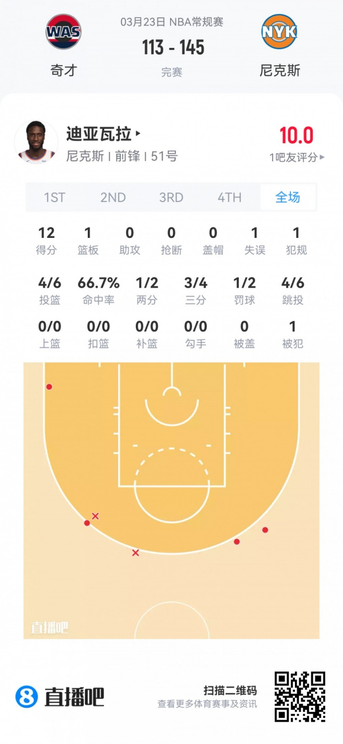 尼克斯次轮51号秀穆罕默德·迪亚瓦拉 登场19.8分钟