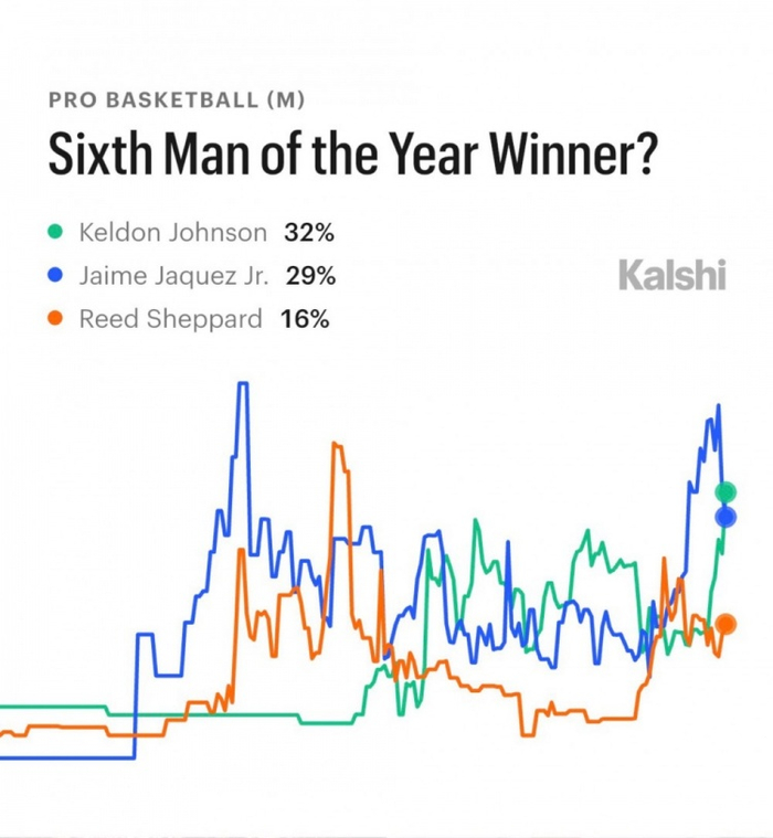 直播吧3月23日讯 体育预测平台Kalshi最新数据显示,目前马刺球员凯尔登·约翰逊是今年最佳第六人的最大热门人选,他的概率达到32%。
