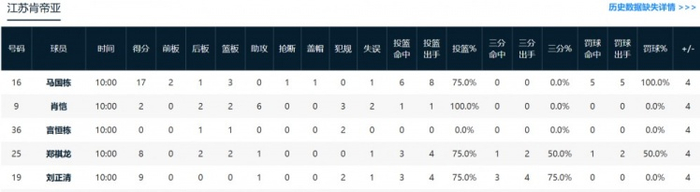 江苏:马国栋17分3篮板1抢断1盖帽。