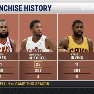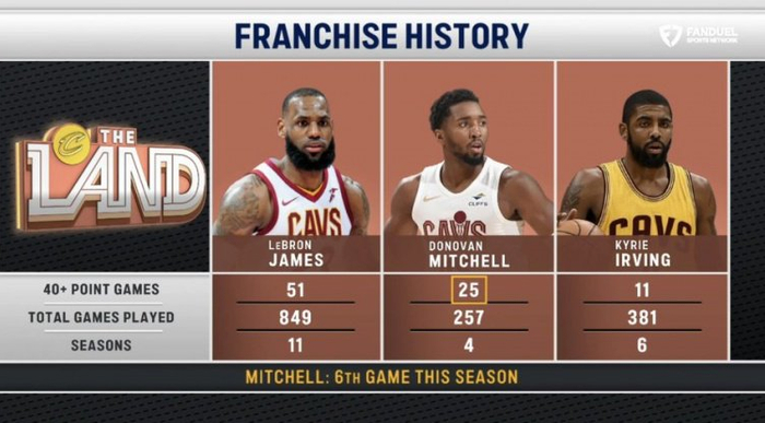 据统计,这是米切尔本赛季第6场40+,骑士生涯第25场,队史第二,仅次于詹姆斯的51场。