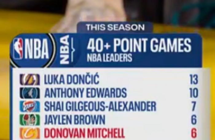 本赛季40+场次:东契奇13次 华子10次 SGA7次 米切尔&布朗6次