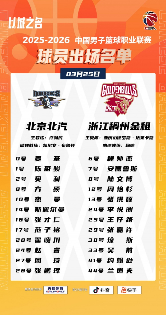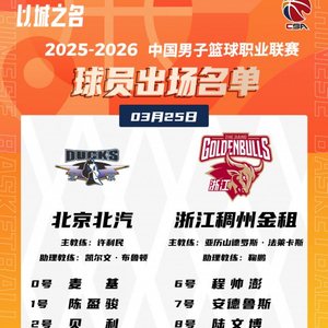 直播吧3月25日讯 19:35北京将在主场迎战浙江,赛前大名单出炉。