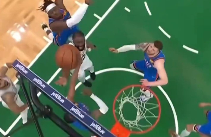直播吧3月27日讯 昨日绿军119-109战胜雷霆,赛后杰伦·布朗在直播时谈到了本场多特对自己上篮的一次粗野防守。