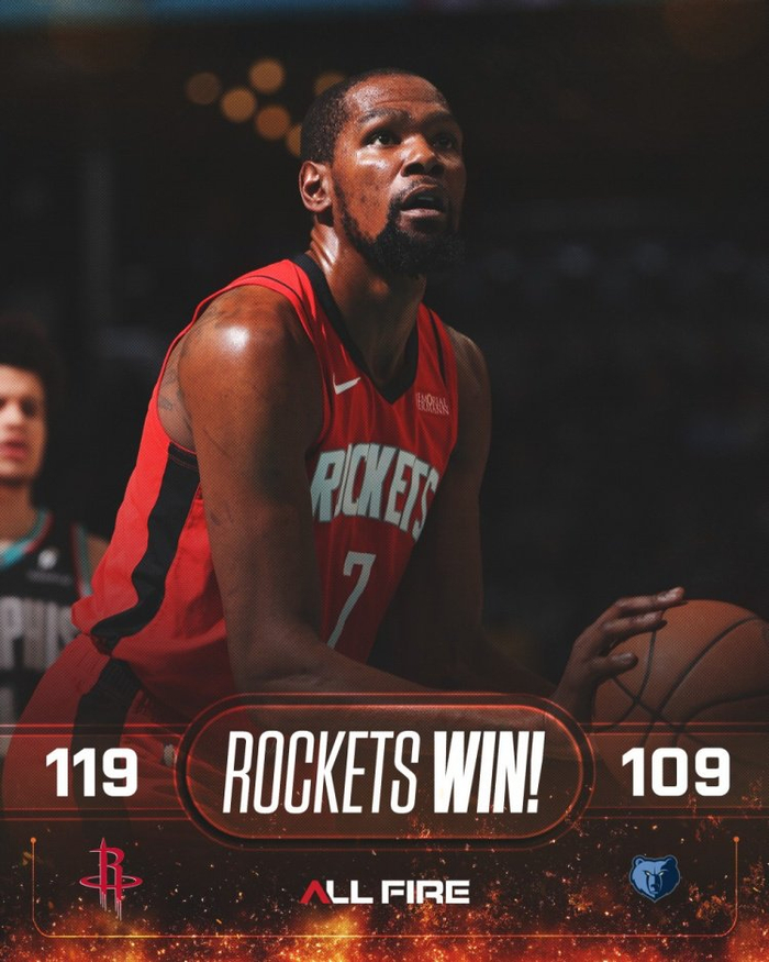 赛后火箭官方发布赢球海报,杜兰特成为封面人物。