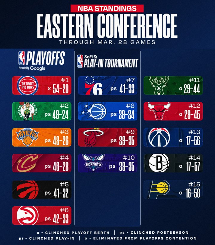 至此东西部无缘季后赛/附加赛的球队分别为: