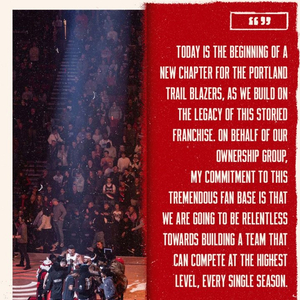 邓顿在公告中写道:“今天是开拓者新篇章的起点,我们将继承这支历史悠久球队的光辉传统。我代表所有权集团,对这支庞大的球迷群体承诺,我们将不遗余力地打造一支每个赛季都能竞争最高水平的强大球队。”