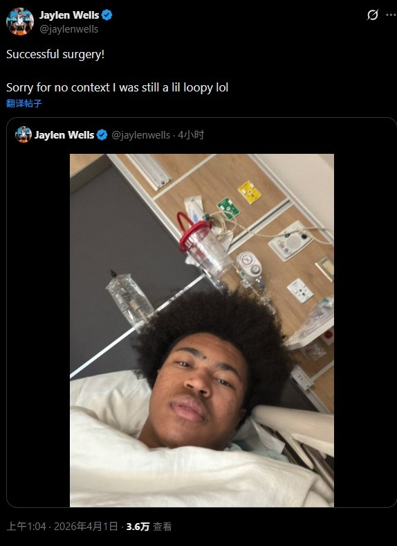 “手术成功!抱歉我没说清楚,当时我还有点迷糊哈。”韦尔斯配文道。