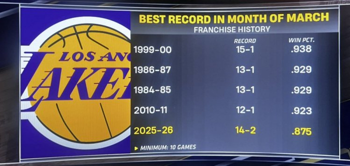湖人三月份目前战绩为14胜2负&胜率高达87.5% 队史第五佳!