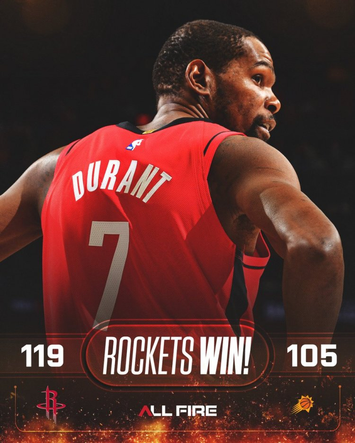 赛后火箭官方晒出本场赢球海报,封面人物是杜兰特。