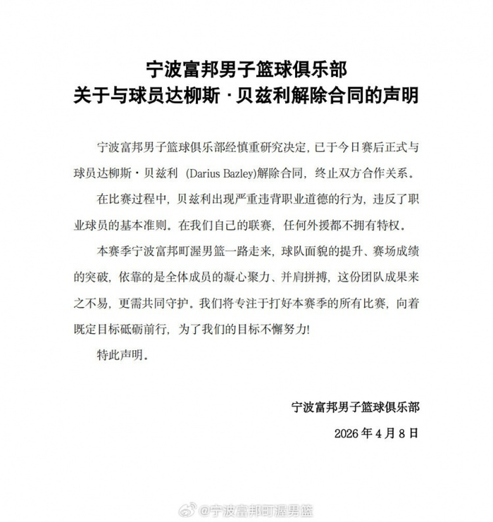赛后,宁波男篮官方社媒发布公告,因在比赛过程中,贝兹利出现严重违背职业道德的行为,球队最终决定与达柳斯·贝兹利(Darius Bazley)解除合同。
