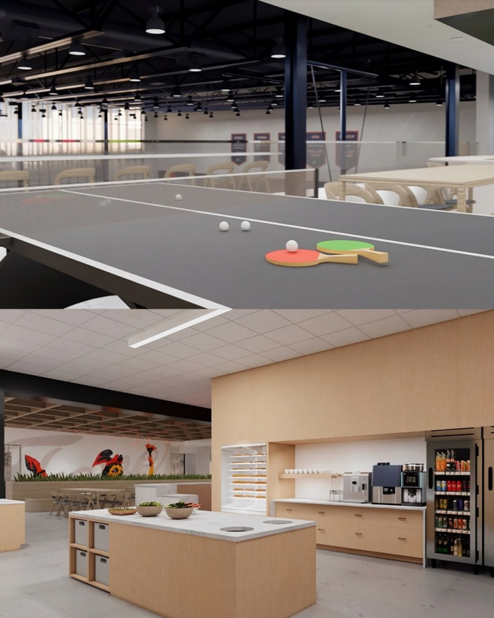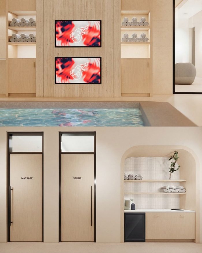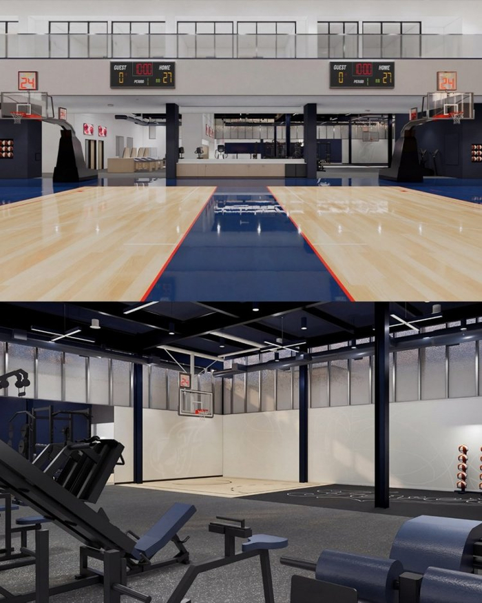 训练馆包括两个采光充足的训练场、有包括水疗池、桑拿等身体恢复设施、内容制作工作室、美甲、发型和化妆沙龙、高尔夫模拟器、儿童托管空间等。