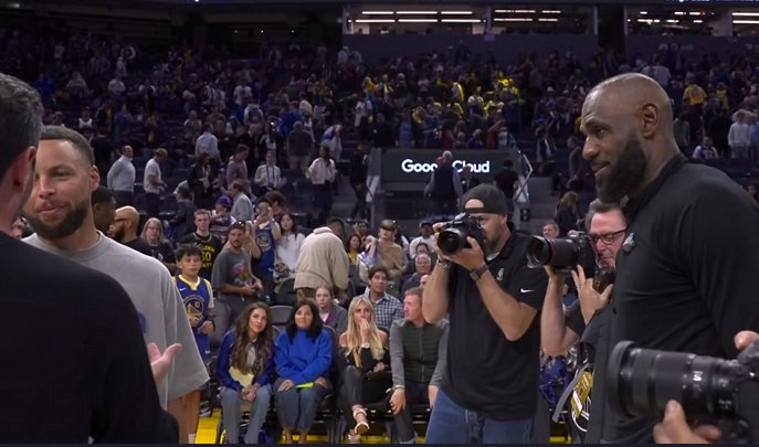 库里专注唠嗑 詹姆斯在一旁耐心等待随后温情相拥🫂