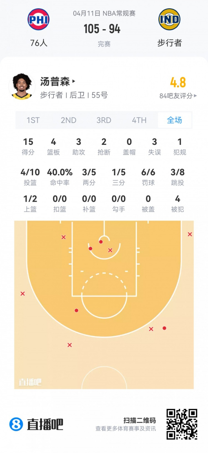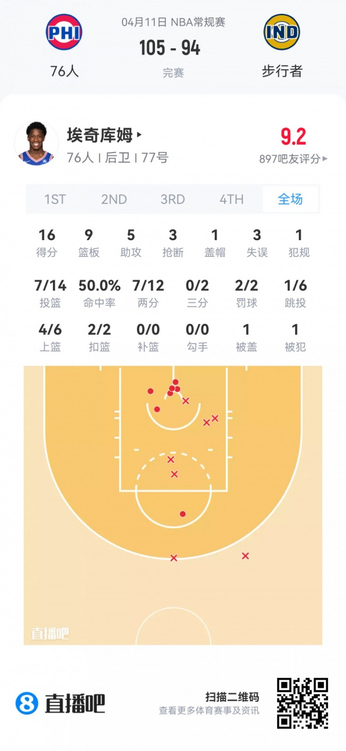 76人探花秀埃奇库姆 登场39.5分钟