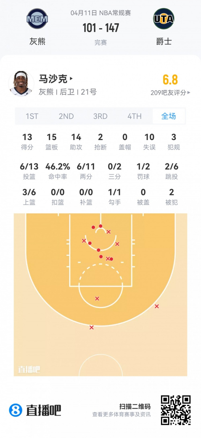 灰熊次轮59号秀马沙克 登场48分钟
