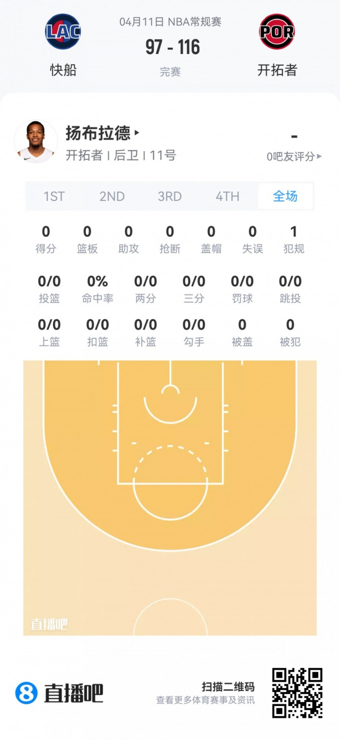 开拓者落选秀扬布拉德 登场1.9分钟