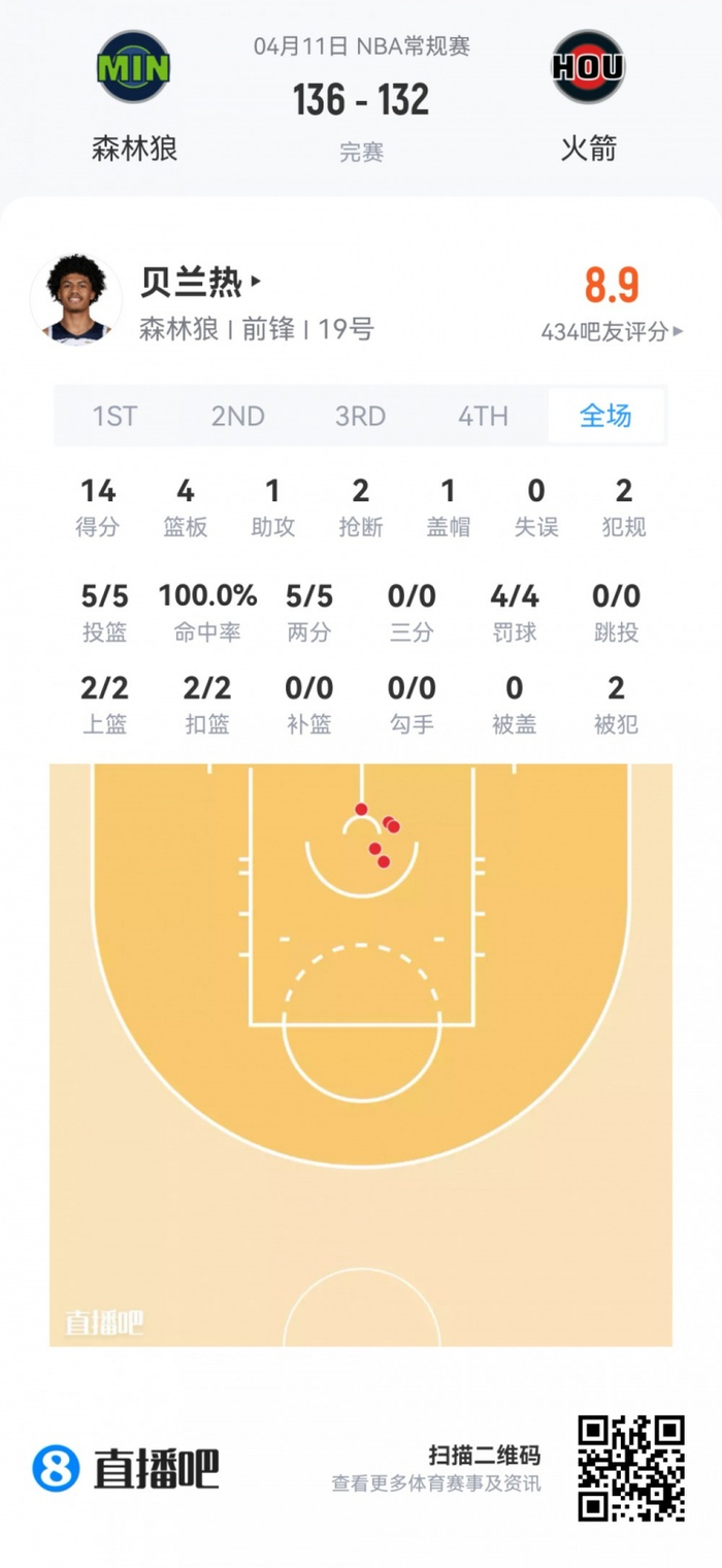 森林狼首轮17号秀贝兰热 登场25.7分钟