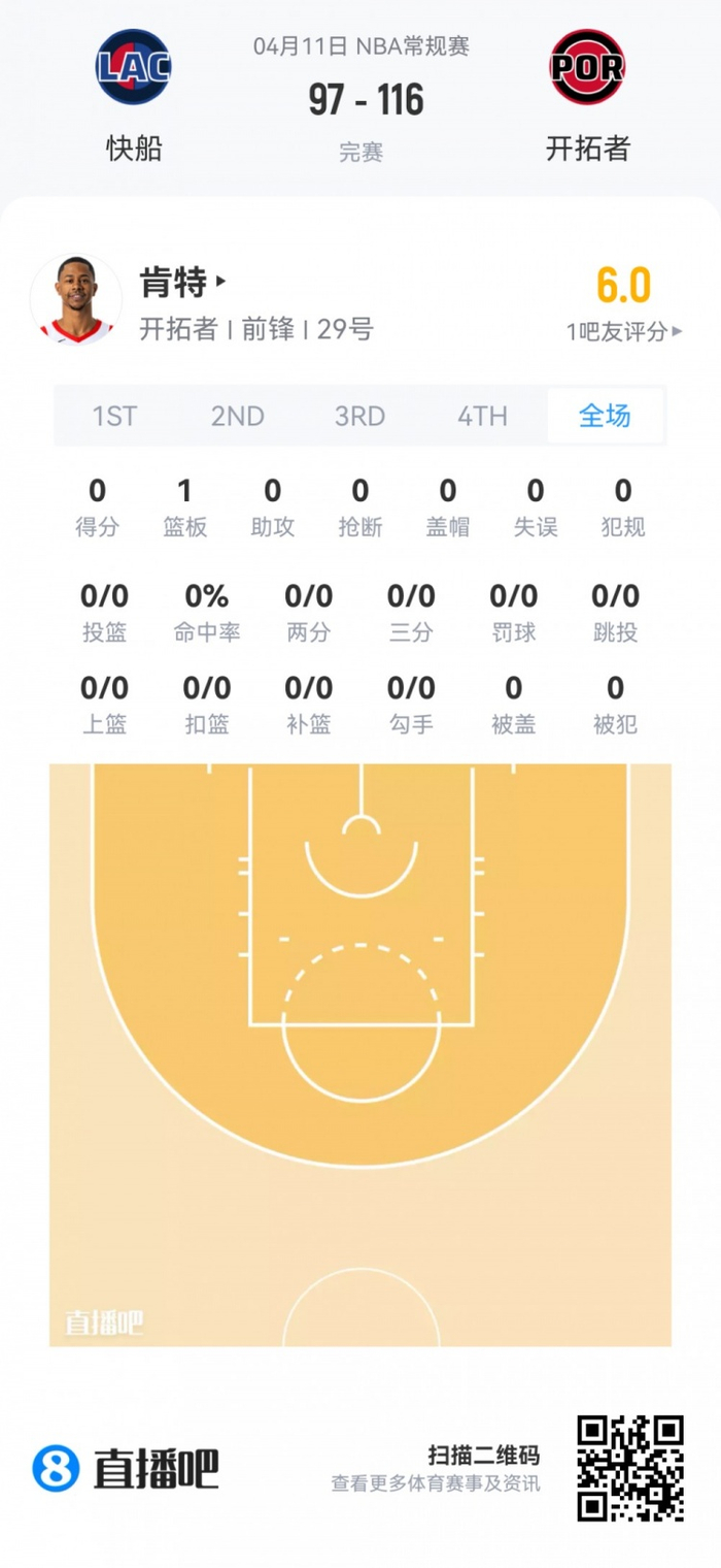 开拓者落选秀肯特 登场1.4分钟