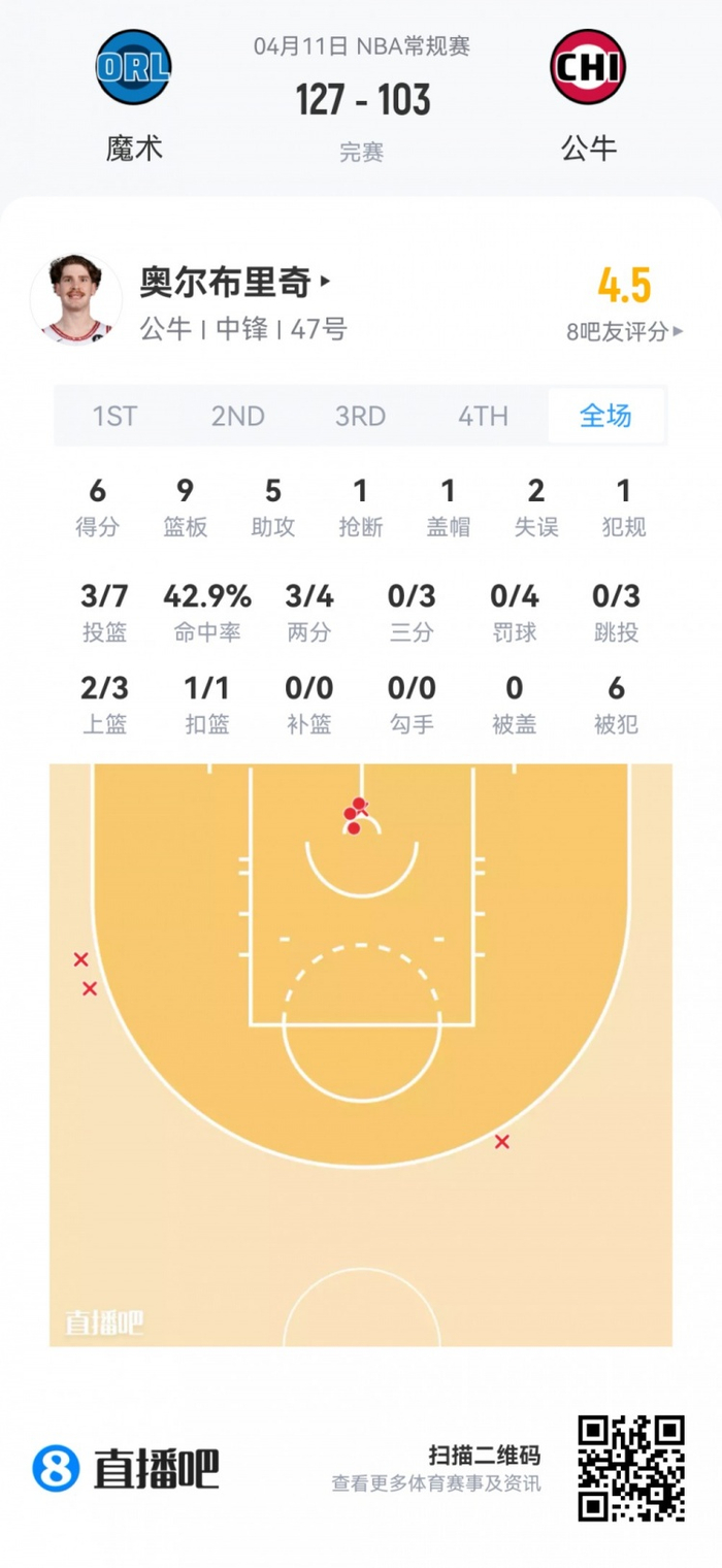 公牛次轮55号秀奥尔布里奇 登场31.6分钟