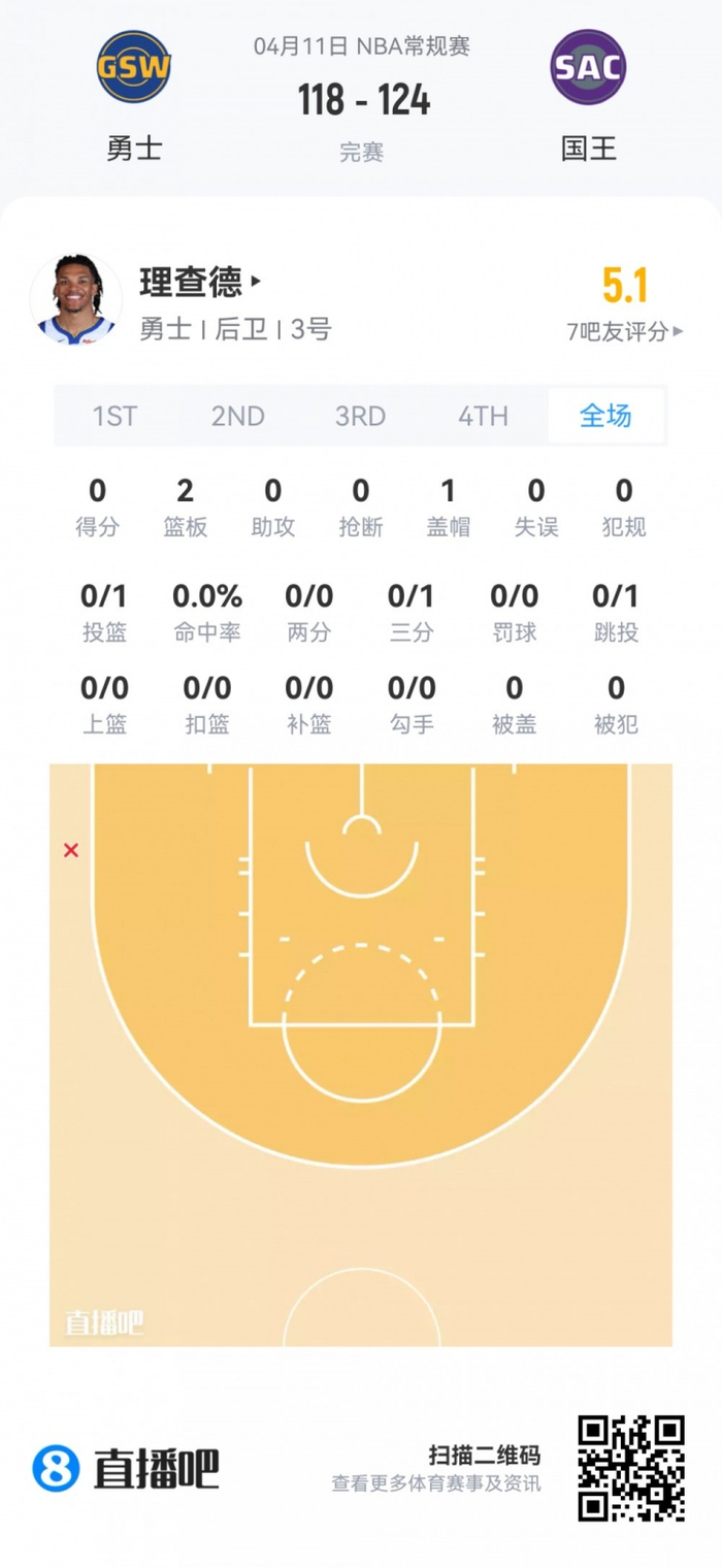 勇士次轮56号秀威尔·理查德 登场2.6分钟