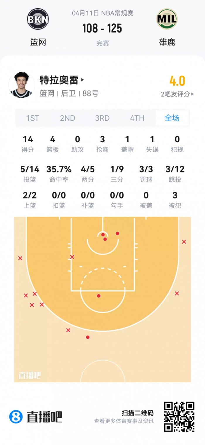 篮网首轮19号秀特拉奥雷 登场16.4分钟