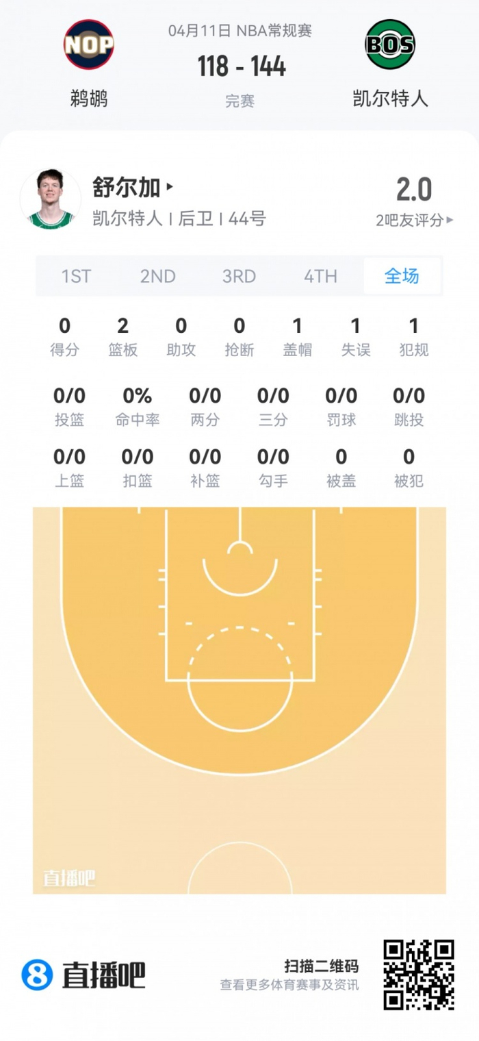 凯尔特人次轮57号秀舒尔加 登场5.6分钟