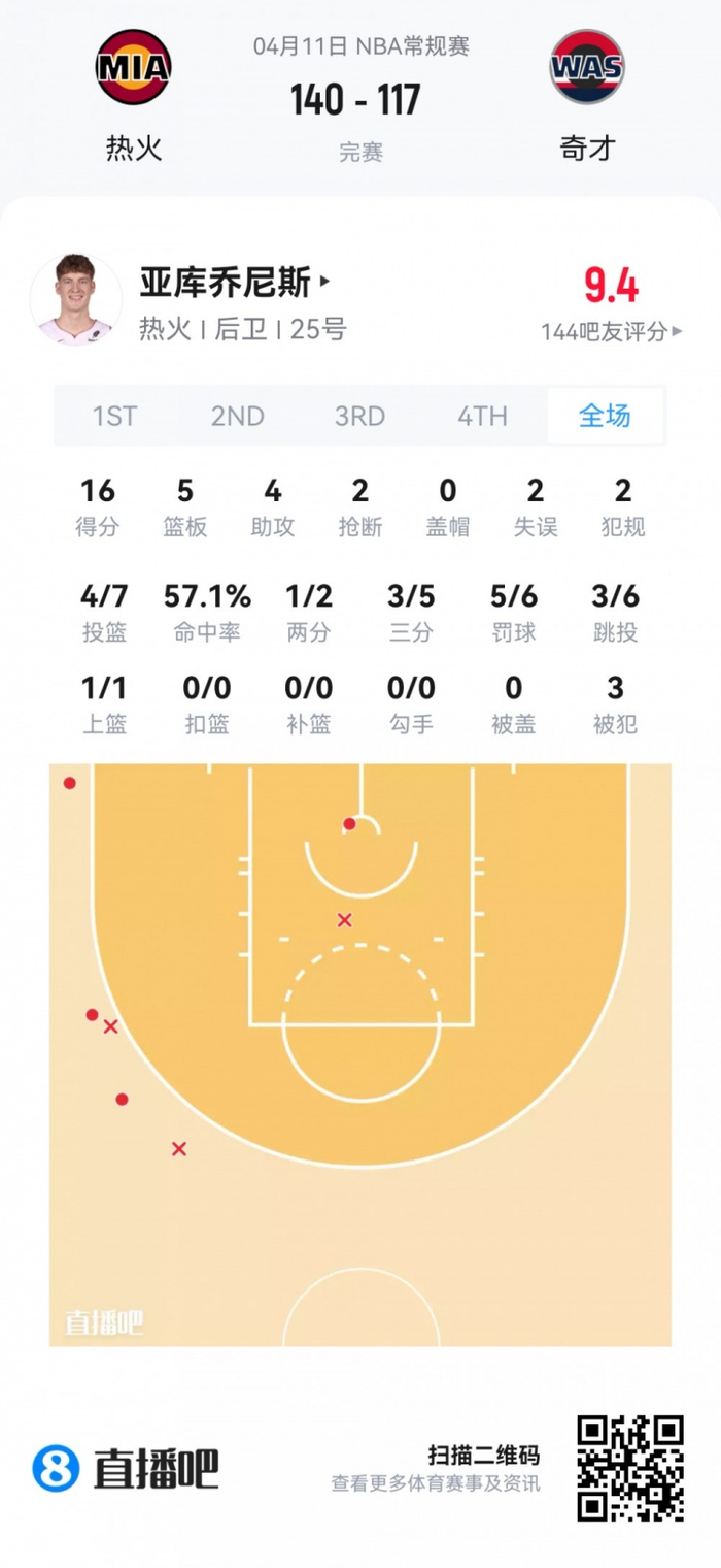 热火首轮20号秀亚库乔尼斯 登场30.9分钟