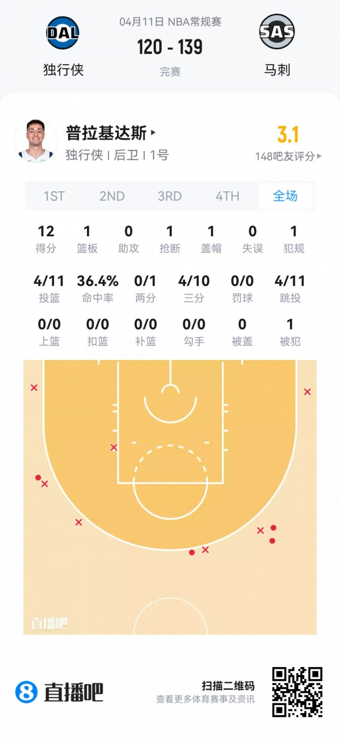 独行侠落选秀普拉基达斯 登场29.6分钟
