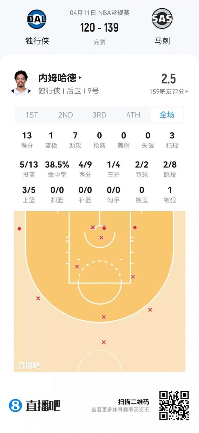 独行侠落选秀瑞安·内姆哈德 登场30.8分钟