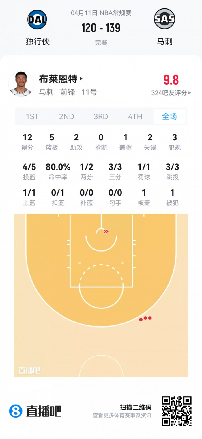 马刺首轮14号秀卡特·布莱恩特 登场25.4分钟