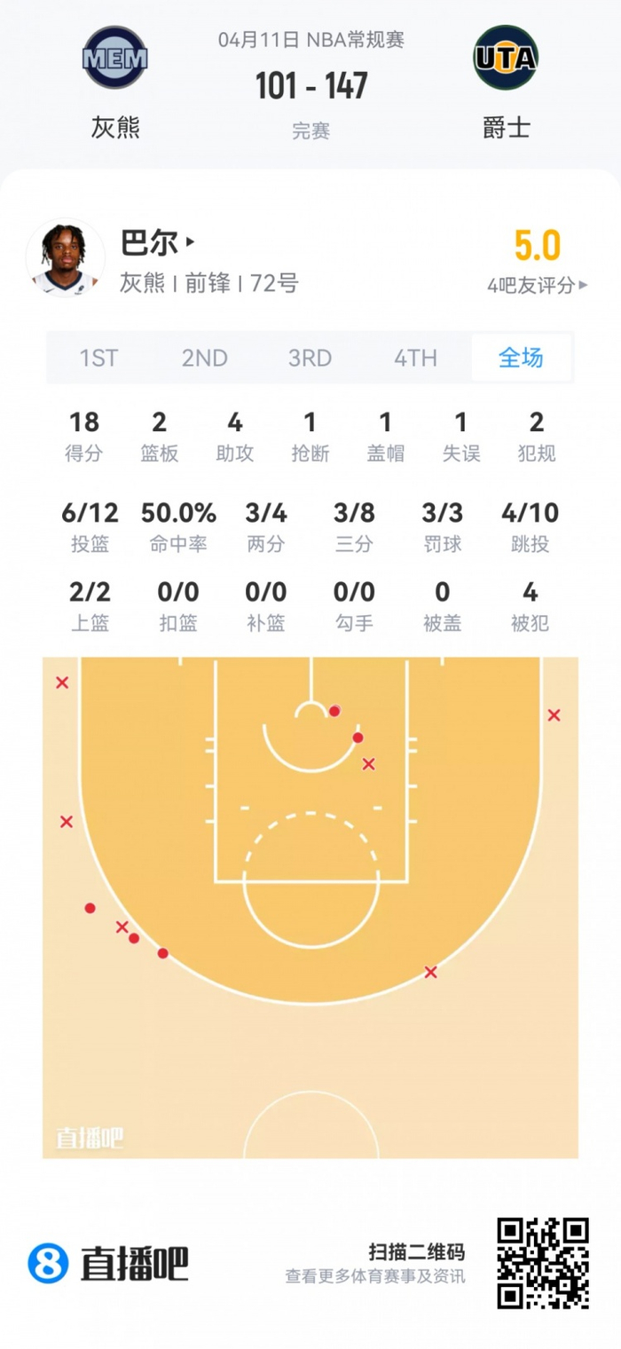 灰熊落选秀巴尔 登场38.5分钟