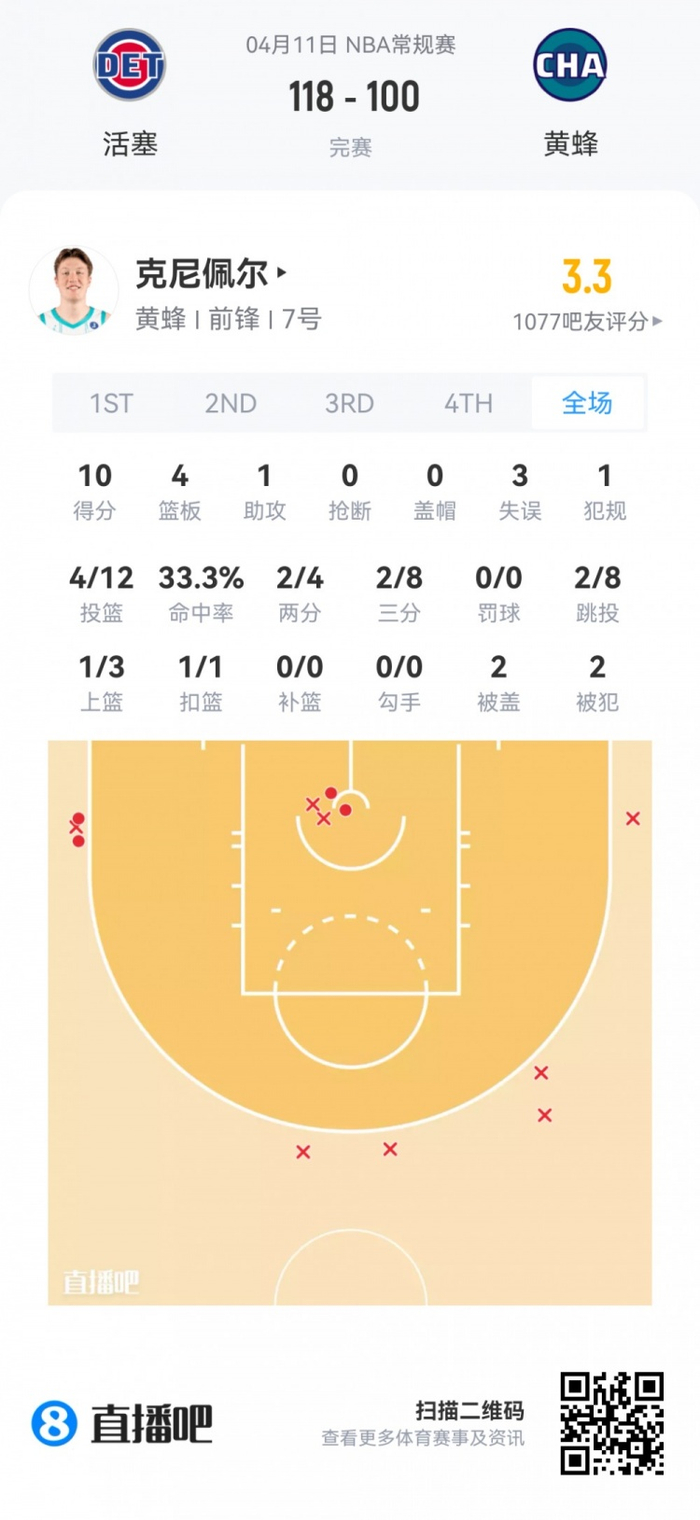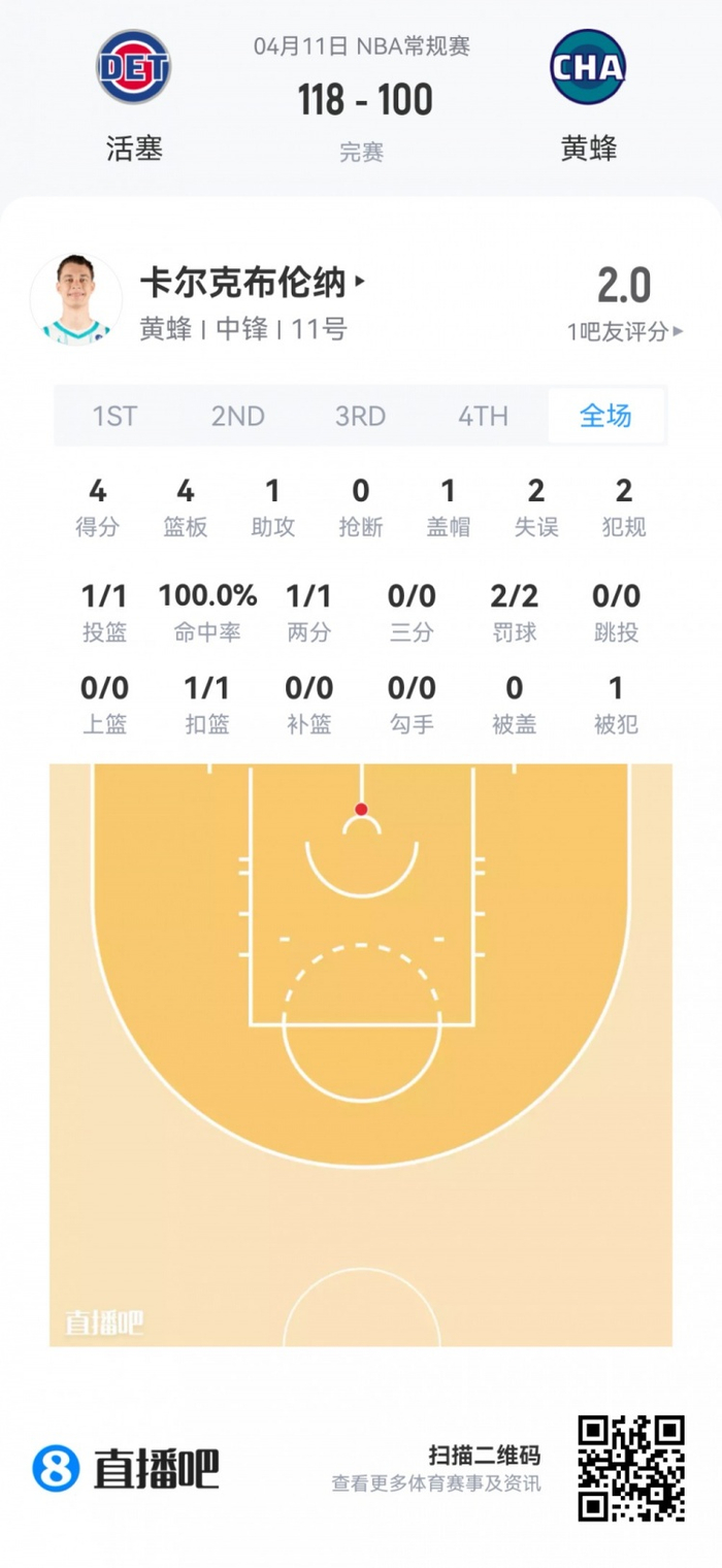 黄蜂次轮34号秀卡尔克布伦纳 登场22.8分钟