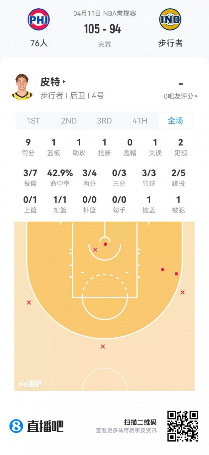 步行者次轮54号秀泰伦·皮特 登场22.6分钟