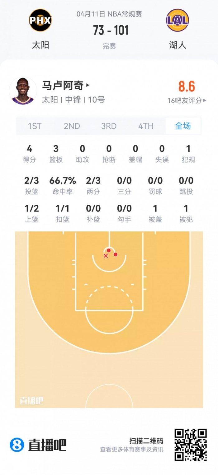太阳首轮10号秀马卢阿奇 登场8分钟