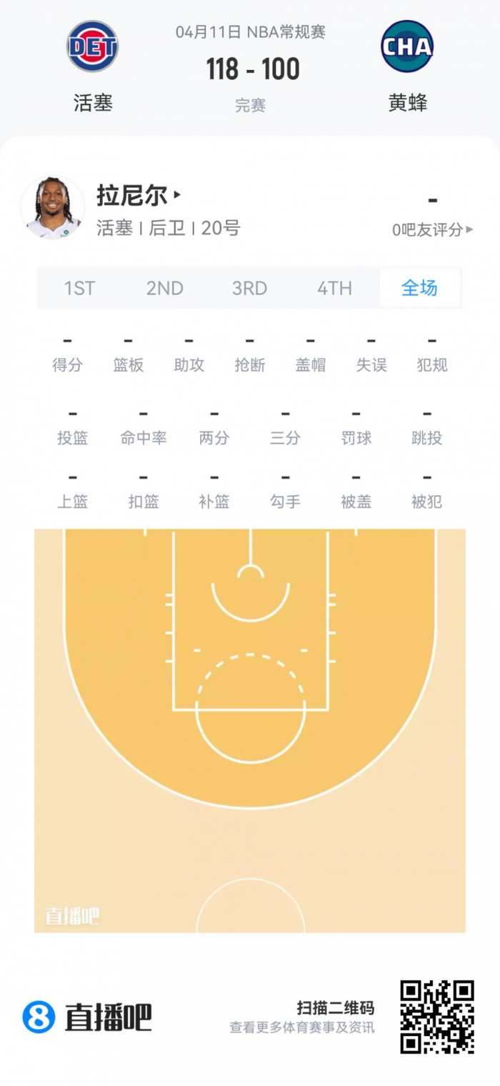 活塞次轮37号秀查兹·拉尼尔 登场1.8分钟