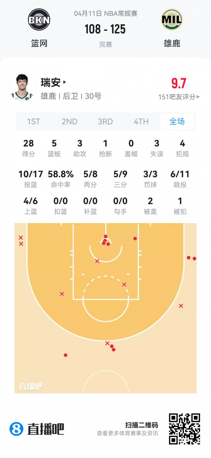 雄鹿落选秀科马克·瑞安 登场34分钟